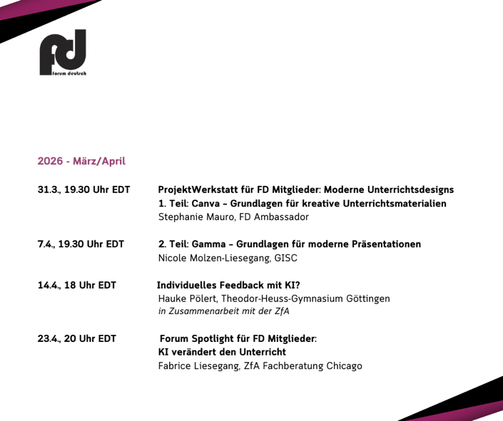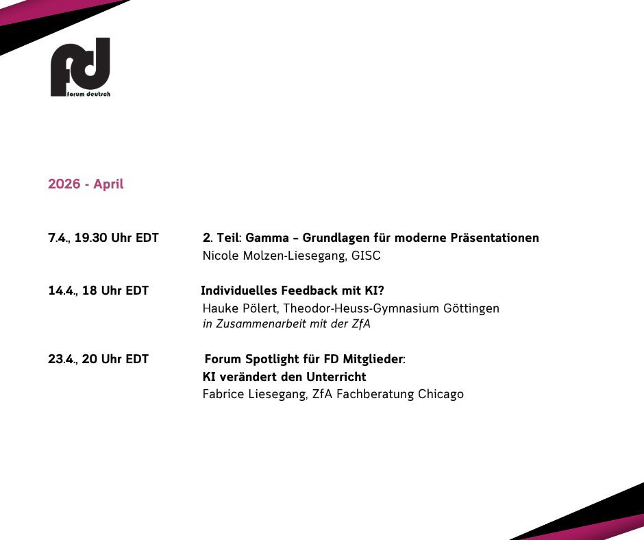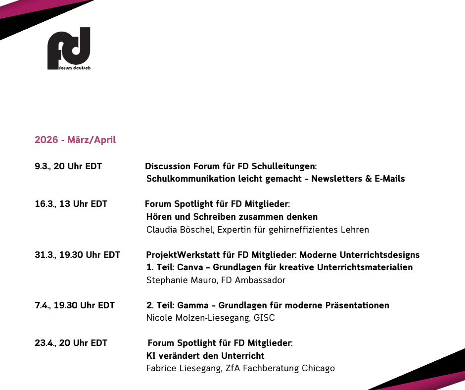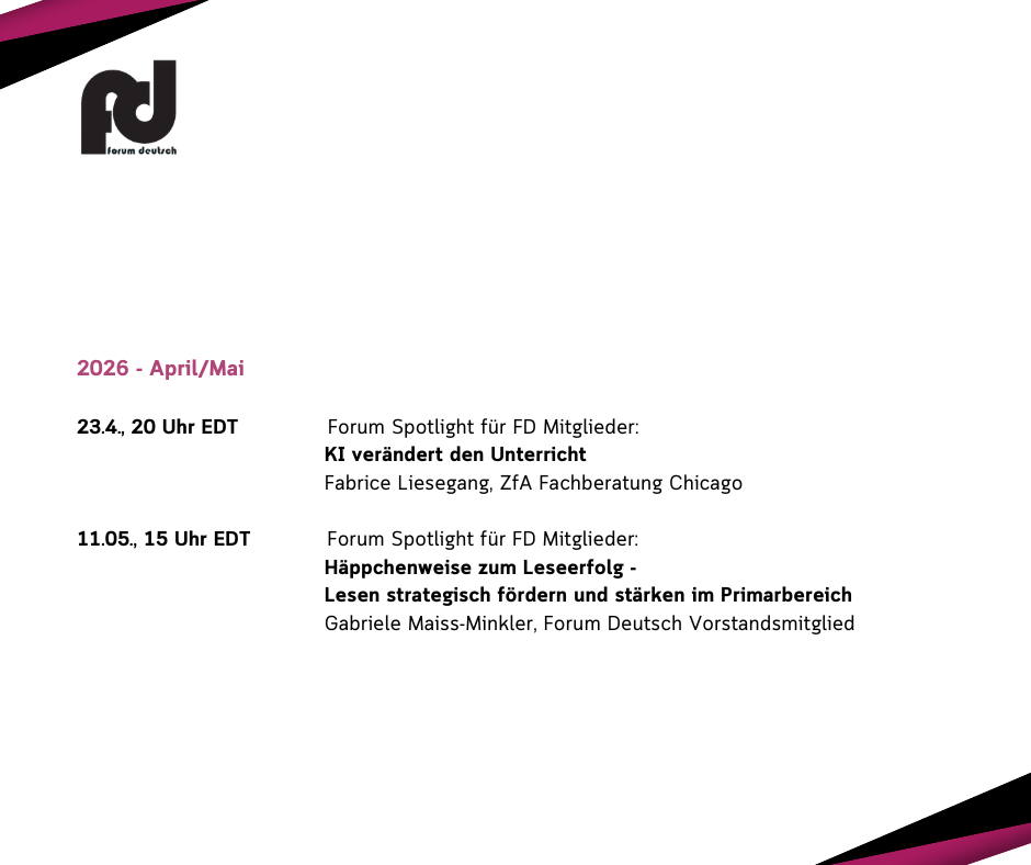 Forum Deutsch is a non-profit 501(c)3 organization dedicated to promoting the German language and German language education.